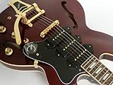 ギブソン直系エピフォンから限定生産にてP90スタイル・ドッグイヤー×3基&ビグスビー搭載の豪華絢爛“リビエラ”が登場!本国アメリカにおいても極一部の楽器店でしか販売されていない特別生産モデルで、日本国内への入荷も極少数のみのレアアイテムです。ワインレッドカラーにゴールドパーツの組み合わせによる高級感溢れるルックスが魅力。しかも価格面も非常にお買い得となっておりますので、この機会をお見逃し無く! ※商品の特性上、木目・色合い(濃淡)は1本1本異なります。
